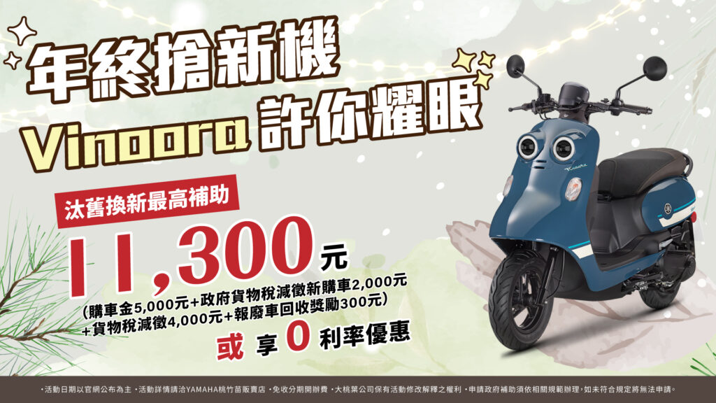 年終搶新機,Vinoora許你耀眼 汰舊換新最高補助11,300元 現金購車享購車金5,000元+政府貨物稅減