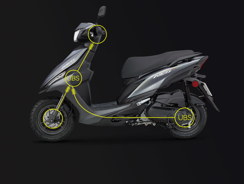 透過前、後輪連動煞車有效縮短煞車距離並降低煞車不及風險。
